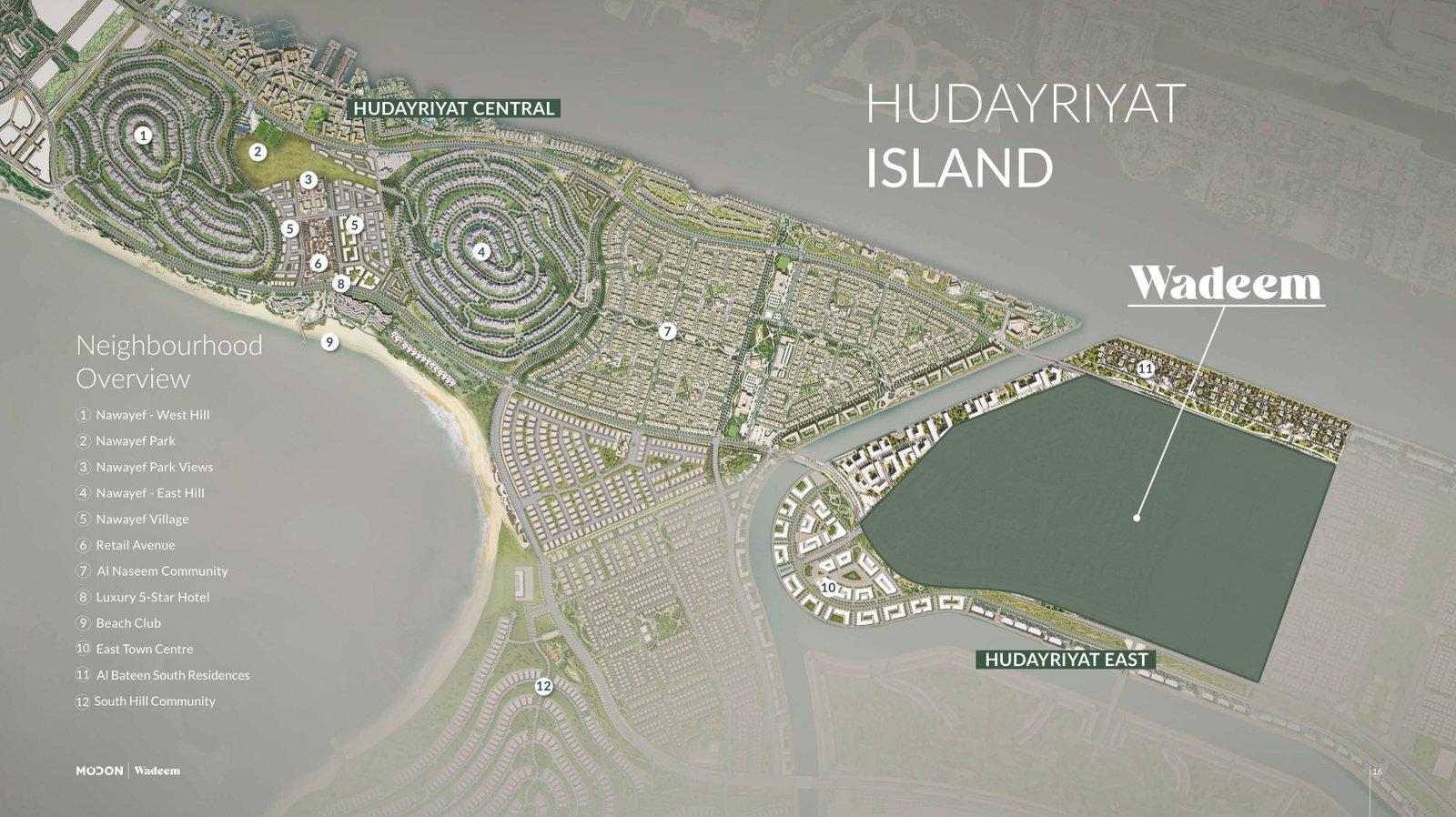 Wadeem Plots is Modon’s first villa‑plot community on Hudayriyat Island, Abu Dhabi, featuring over 1,700 plots designed for 4, 5 and 6 bedroom custom villas with private gardens and pools.